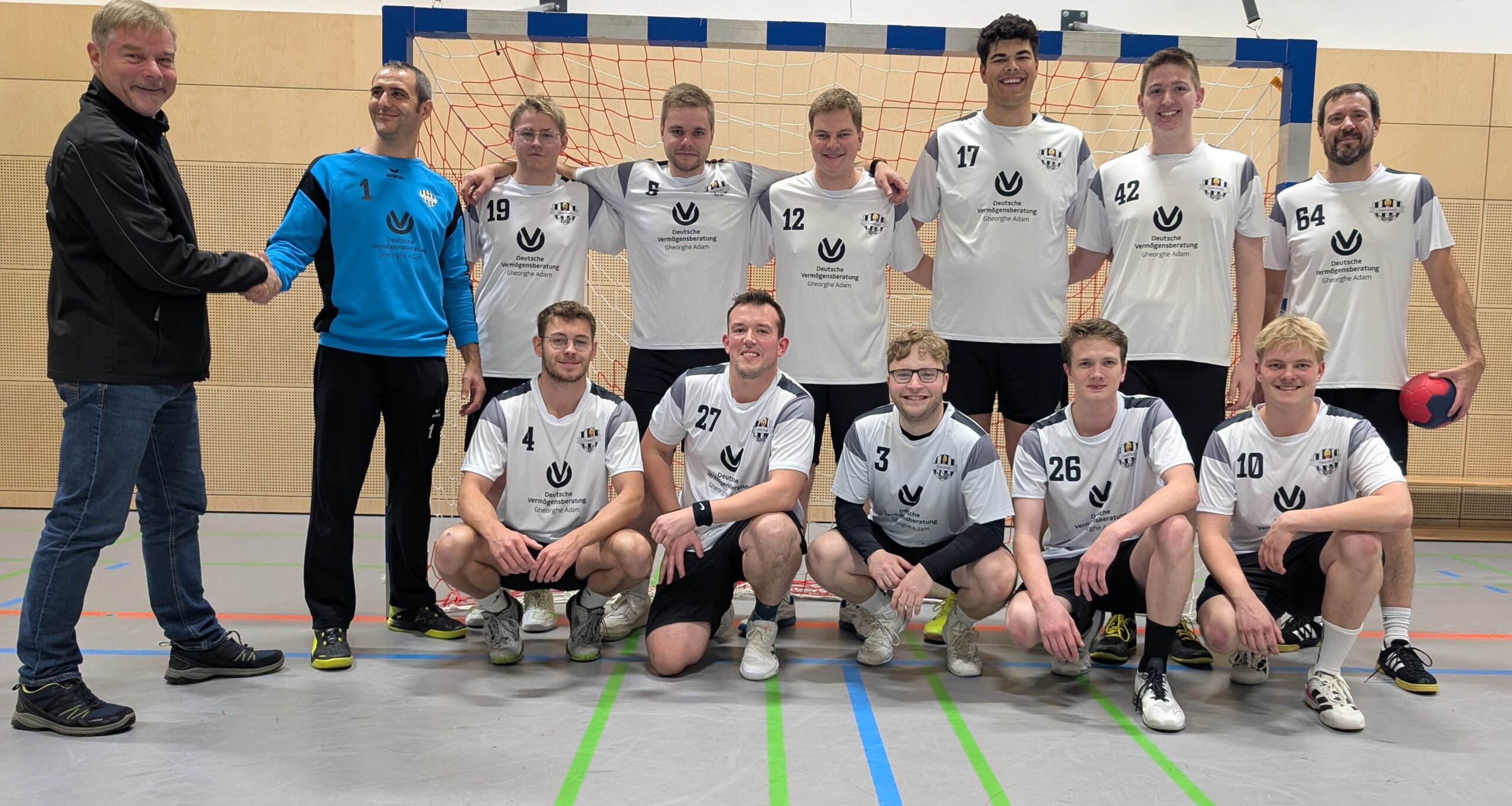 Gheorghe Adam, Torwart der Handballherren und Berater der Deutschen Vermögensberatung mit Sitz in Meppen hat seinen Mitspielern einen neuen Trikotsatz gesponsort. Trainer Stefan Klaßen bedankt sich…